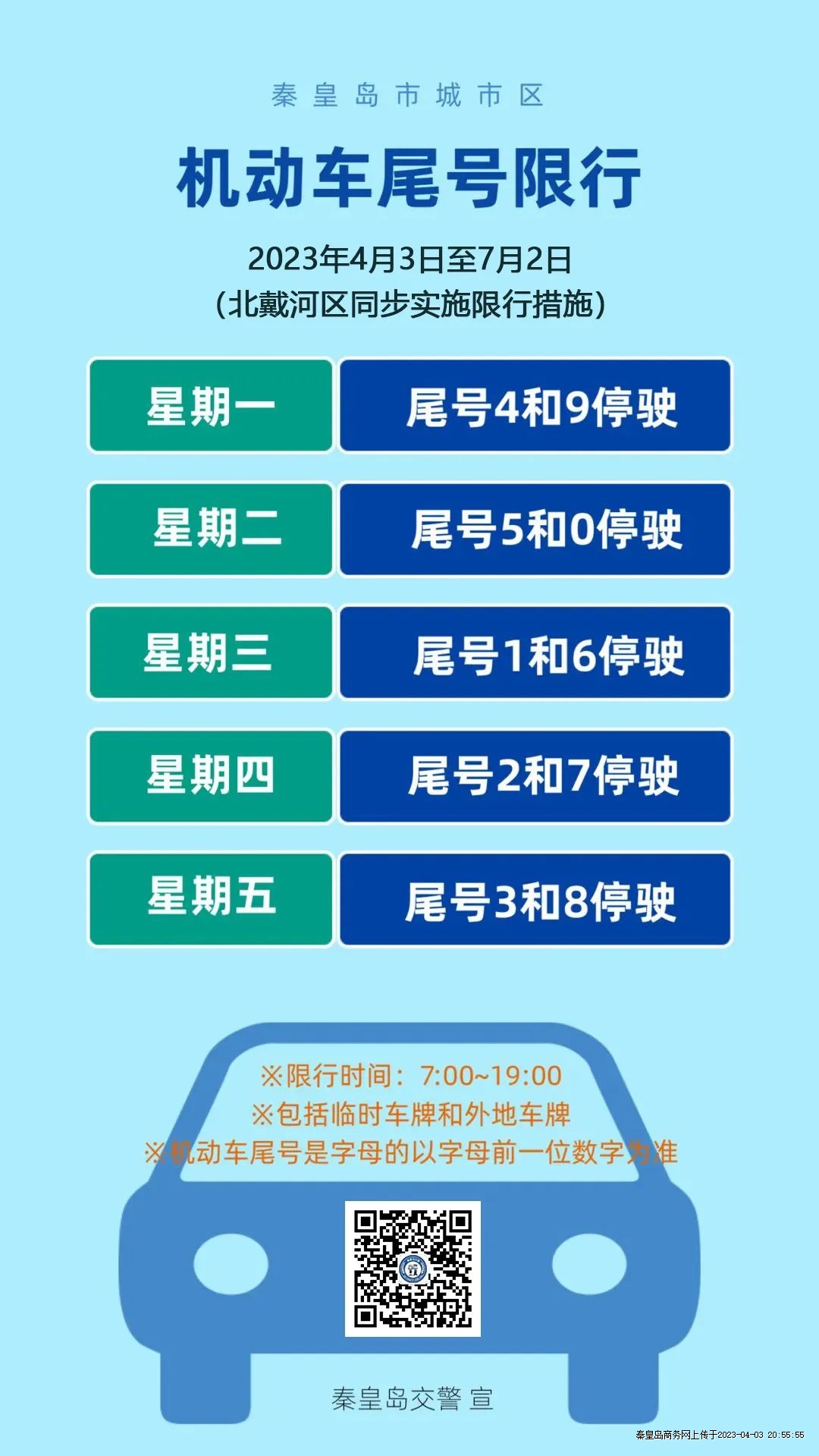 依據(jù)《秦皇島市人民政府關(guān)于恢復(fù)實(shí)施城市區(qū)機(jī)動(dòng)車(chē)尾號(hào)限行措施的通告》有關(guān)規(guī)定,我市機(jī)動(dòng)車(chē)限行尾號(hào)與北京市一致,每日限行兩個(gè)尾號(hào)(尾號(hào)是字母的,以車(chē)牌最后一位數(shù)字為準(zhǔn))的機(jī)動(dòng)車(chē),特殊時(shí)段及重污染天氣期間限行措施另行通告。
